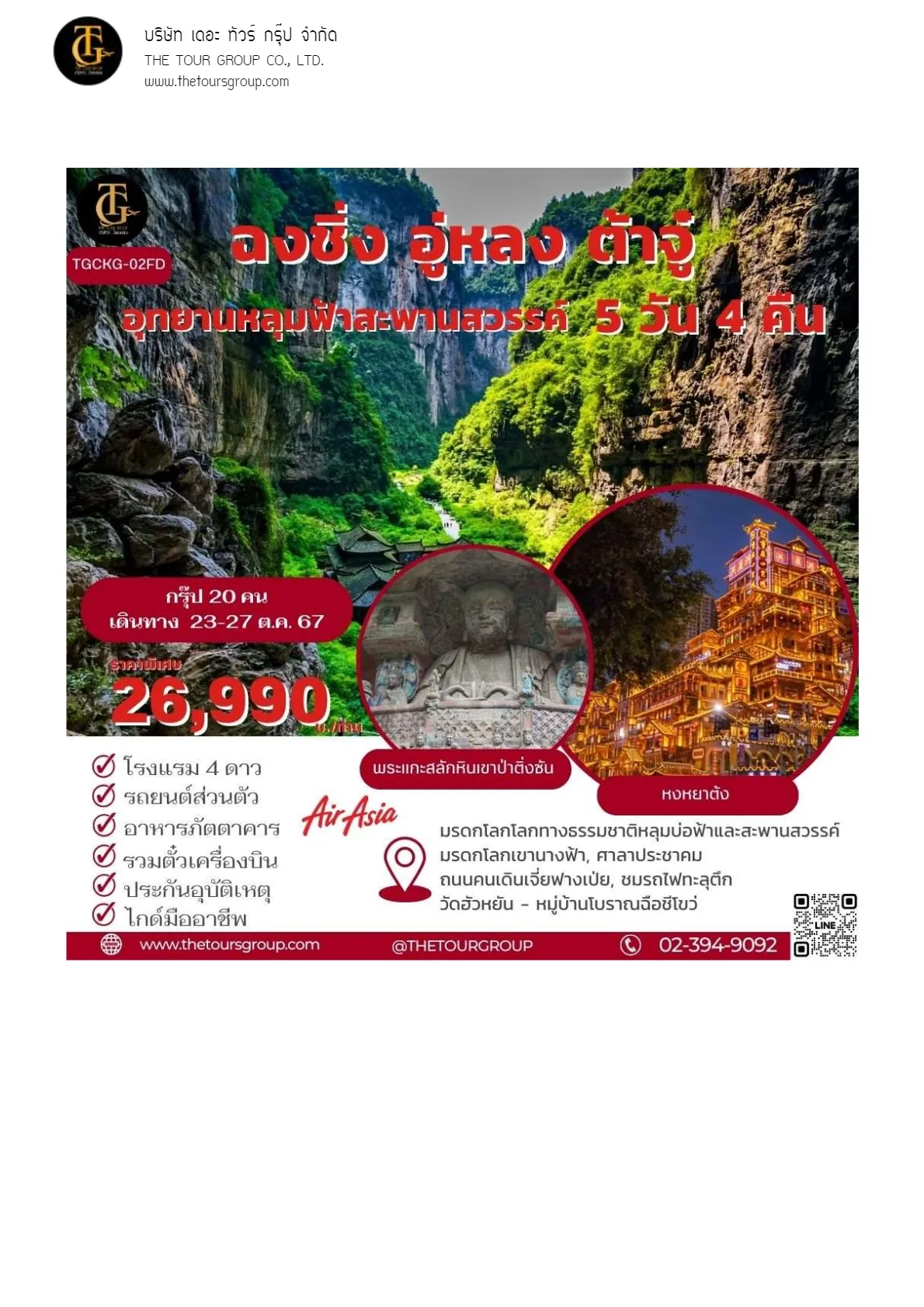 TGCKG-02FD ฉงชิ่ง อู่หลง ต้าจู๋ อุทยานหลุมฟ้าสะพานสวรรค์ 5D4N 23-27 OCT 24